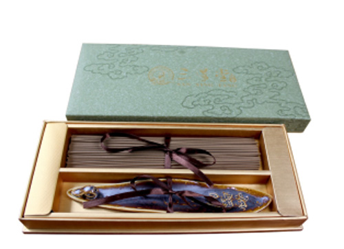 本品香味中略带甜味,清新怡人,具有良好的收敛、清凉、滋补、强身功效,亦可净化空气。『品名』新山檀香(卧香)。『规 格』120条*21cm配精美点香具一个。『成 分』新山檀香。全国统一零售价:218元
