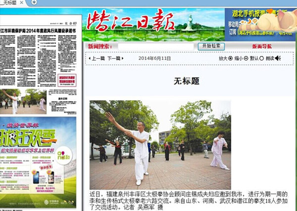 4月26日至5月3日,协会顾问庄锡成夫妇应邀到湖北省潜江市交流李和生传杨式内功太极拳老六路。来自山东、河南、武汉和潜江的拳友18人参加了交流活动。潜江市太极拳协会许会长也闻讯看望交流活动。