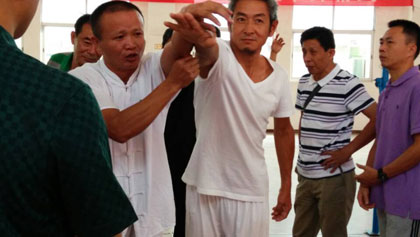 交流中,庄锡成先生就太极拳常见的双重、松沉、动静、虚灵顶劲和神意引领等功法,逐一分析讲解,并与拳友搭手体会,让拳友用身体感受太极拳功法。