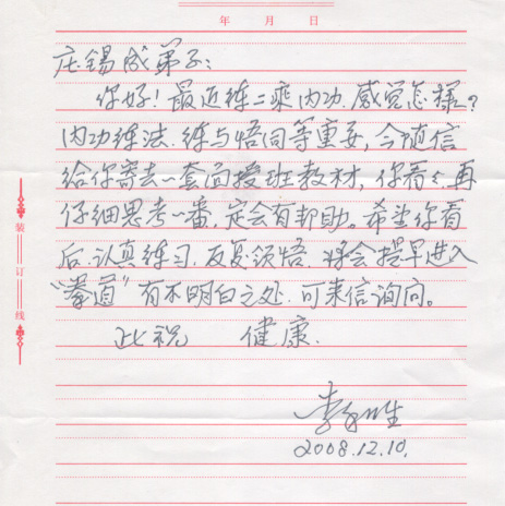 2007年5月,恩师李和生先生来泉州授拳,曾给笔者题词及书信“练与悟同等重要”。当时,笔者初识老六路,不能深刻理解恩师教诲。