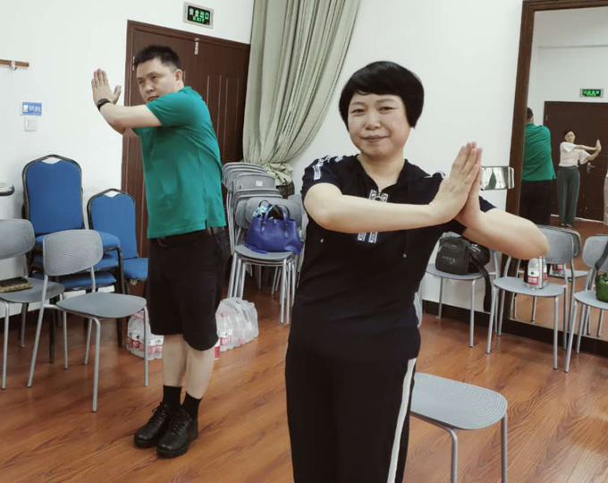 拳友郭彩霞、史晓丹、韩晓慧,都非常喜欢站桩。她们都被太极拳养生、修心的魅力深深折服。郭彩霞说,她“站桩时感觉自己身轻如燕,像一片羽毛和大自然融为一体,霎时间所有的压力与不快都慢慢走远了,感觉身体彻底放松了。切实感受到庄老师所说,太极拳越练越舒服,正能量越攒越多。”史晓丹说:“通过这次学习,以及前两次泉州张伟鹏师兄的交流分享,当场就体会到一点点太极的感觉,虽然腰力还是很弱。但理念已深入我心了。很喜欢无极桩的感觉。拗动六环功虽是第一次学习,但能感觉身体微微发热,也有注意力完全集中后的澄澈,要是能坚持练习,一定有意想不到的效果。”拳友韩晓慧分享:周末的培训让我对太极拳真正影响人生有了更坚定的信念。从养生而言,太极拳练腰、练肾、松经络,为健康保驾护航。从心性而言,练功要诀“神内敛”回归自己,安于当下。“呼气,把心放下”平和、放松。“一跪,是跪意”虔诚、敬畏之心。太极心法是治愈现代浮躁生活的良药。太极拳作为传统文化的精髓,强体修身养性。认准了就坚持下去。不需要用意志力坚持,自然而然地,太极生活化。