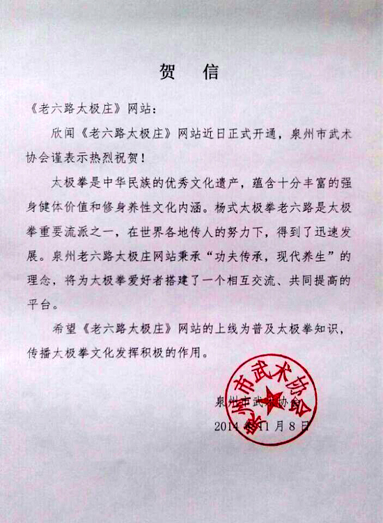 欣闻《老六路太极庄》网站近日正式开通,泉州市武术协会谨表示热烈祝贺!