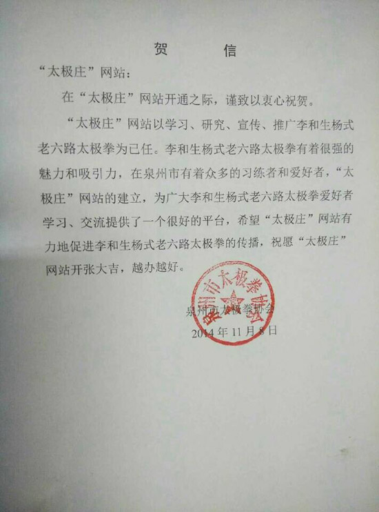 贺 信 《太极庄》网站: 在《太极 庄》网站开通之际,谨致以衷心祝贺! 《 太极庄》网站以学习、研究、宣传、推广李和生传杨式老六路太极拳为已任。李和生传杨老六路太极拳有着很强的魅力和吸引力,在泉州有着众多的习练者和爱好者,《太极庄》网站的建立,为广大李和生传杨式老六路太极拳爱好者学习、交流提供了一个很好的平台,希望《太极庄》网站有力地促进李和生传杨式老六路太极拳的传播。祝愿《太极庄》网站开张大吉,越办越好。