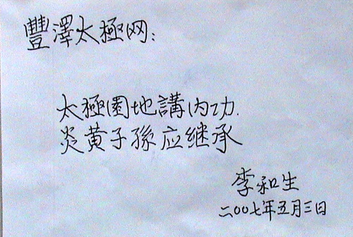 2007年5月3日,李和生大师为丰泽太极网题词