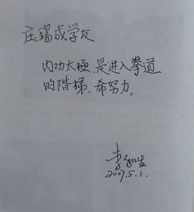 2007年5月1日,李和生大师在其著作《内功解秘》上为庄锡成题字
