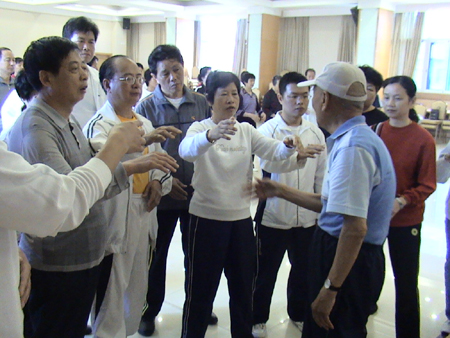 北京太极拳名家李和生大师应邀于4月28日至5月2日来泉州举办太极内功讲座。培训讲座主要内容是传授太极内功第三承功夫----以意领气。李大师与参学学员一对一地传授第三承功夫--练意念,并系统介绍了内功推手的听劲、问劲、发劲、错劲、分劲及无极桩、养气桩(坎中满)、松功桩(离中虚)、虚引手等功法劲法。