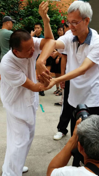 交流中,庄锡成先生就太极拳常见的双重、松沉、动静、虚灵顶劲和神意引领等功法,逐一分析讲解,并与拳友搭手体会,让拳友用身体感受太极拳功法。