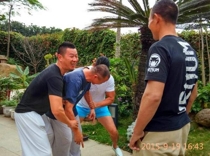 2015年9月19日,泉州同门拳友杨胜丹等人与广州李斌老师来访。李斌老师祖籍山东,曾荣获1990年80公斤级全国搏击冠军,曾代表国家到新加坡教学散打、拳击、巴西柔术、反关节擒拿。李斌老师作为优秀人才被广州市引进,现为广州华德福战略合作伙伴,专门从事培训问题儿童的运动治疗和青少年、成年人的搏击教学。早年曾在泉州散打联盟任教练。 有朋自远方来,不亦乐乎。庄锡成先生与李斌老师热情友好交流,谈散打竞技,讲太极功法,论养生之道,宾朋尽兴,无所不谈。期间,李斌老师还兴致地与庄锡成先生搭手交流,李斌老师竞技手法娴熟多变,招招紧逼,庄锡成先生悠闲自在,自然相随。揉手后,李斌老师兴致勃勃地说:“很舒服,我们俩个如同下棋”。庄锡成先生还与拳友们交流了太极拳的腰功与松沉劲等。
