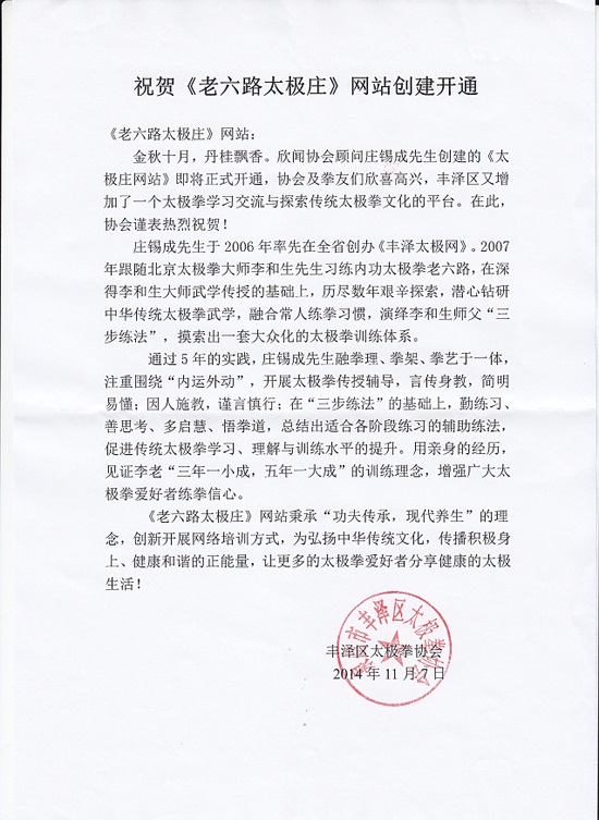 祝贺《老六路太极庄》网站创建开通 《老六路太极庄》网站: 金秋十月,丹桂飘香。欣闻协会顾问庄锡成先生创建的《太极庄网站》即将正式开通,协会及拳友们欣喜高兴,丰泽区又增加了一个太极拳学习交流与探索传统太极拳文化的平台。在此,协会谨表热烈祝贺! 庄锡成先生于2006年率先在全省创办《丰泽太极网》。2007年跟随北京太极拳大师李和生先生习练内功太极拳老六路,在深得李和生大师武学传授的基础上,历尽数年艰辛探索,潜心钻研中华传统太极拳武学,融合常人练拳习惯,演绎李和生师父“三步练法”,摸索出一套大众化的太极拳训练体系。 通过5年的实践,庄锡成先生融拳理、拳架、拳艺于一体,注重围绕“内运外动”,开展太极拳传授辅导,言传身教,简明易懂;因人施教,谨言慎行;在“三步练法”的基础上,勤练习、善思考、多启慧、悟拳道,总结出适合各阶段练习的辅助练法,促进传统太极拳学习、理解与训练水平的提升。用亲身的经历,见证老李“三年一小成,五年一大成”的训练理念,增强广大太极拳爱好者练拳信心。 《老六路太极庄》网站秉承“功夫传承,现代养生”的理念,创新开展网络培训方式,为弘扬中华传统文化,传播积极身上、健康和谐的正能量,让更多的太极拳爱好者分享健康的太极生活! 丰泽区太极拳协会 2014年11月7日